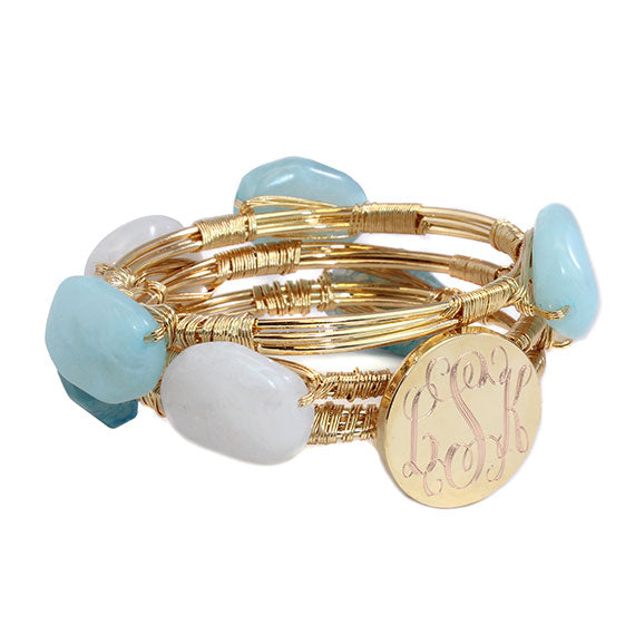 Accessorize with this must have engraveable wire wrap bracelet set! The set comes with three bracelets, one with an engraveable gold colored 1" (26 mm) disk. The gold color wire compliments the cotton white colored, sky blue and aqua blue beads making it a staple piece to add to your collection! If you would like your bracelet engraved, please select the engraved option. Please add a note with your engraving instructions once your item is added to your cart. Please include the font you would like for the engraving and the monogram initials you would like engraved on your bracelet. Please note that initials will be engraved in the order First, Last, Middle. For example, ifĀ the name to engrave isĀ Jessica Elizabeth Smith, your initials will be engraved in the order JSE.Ā Gold plated metal. Font Options:Ā