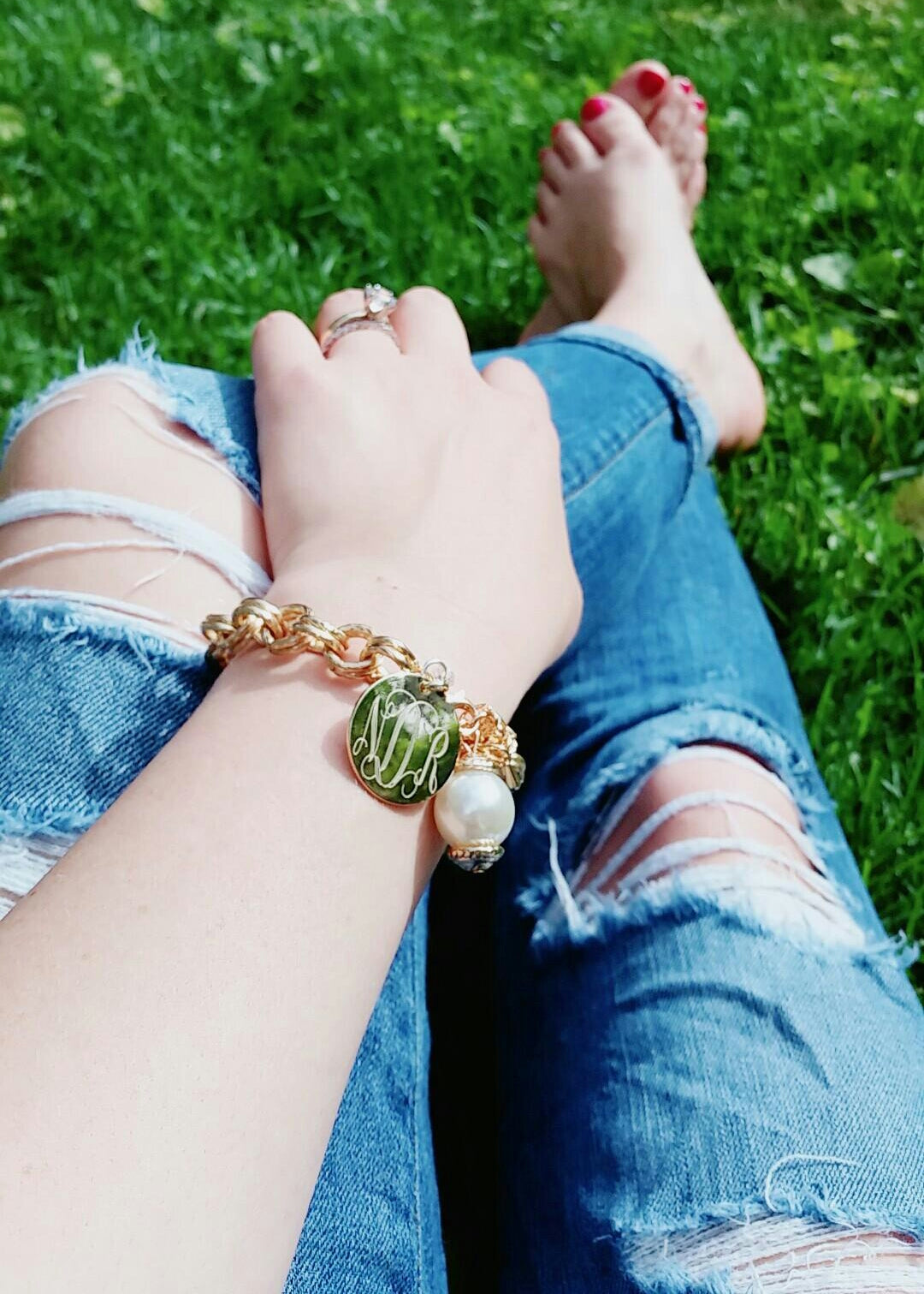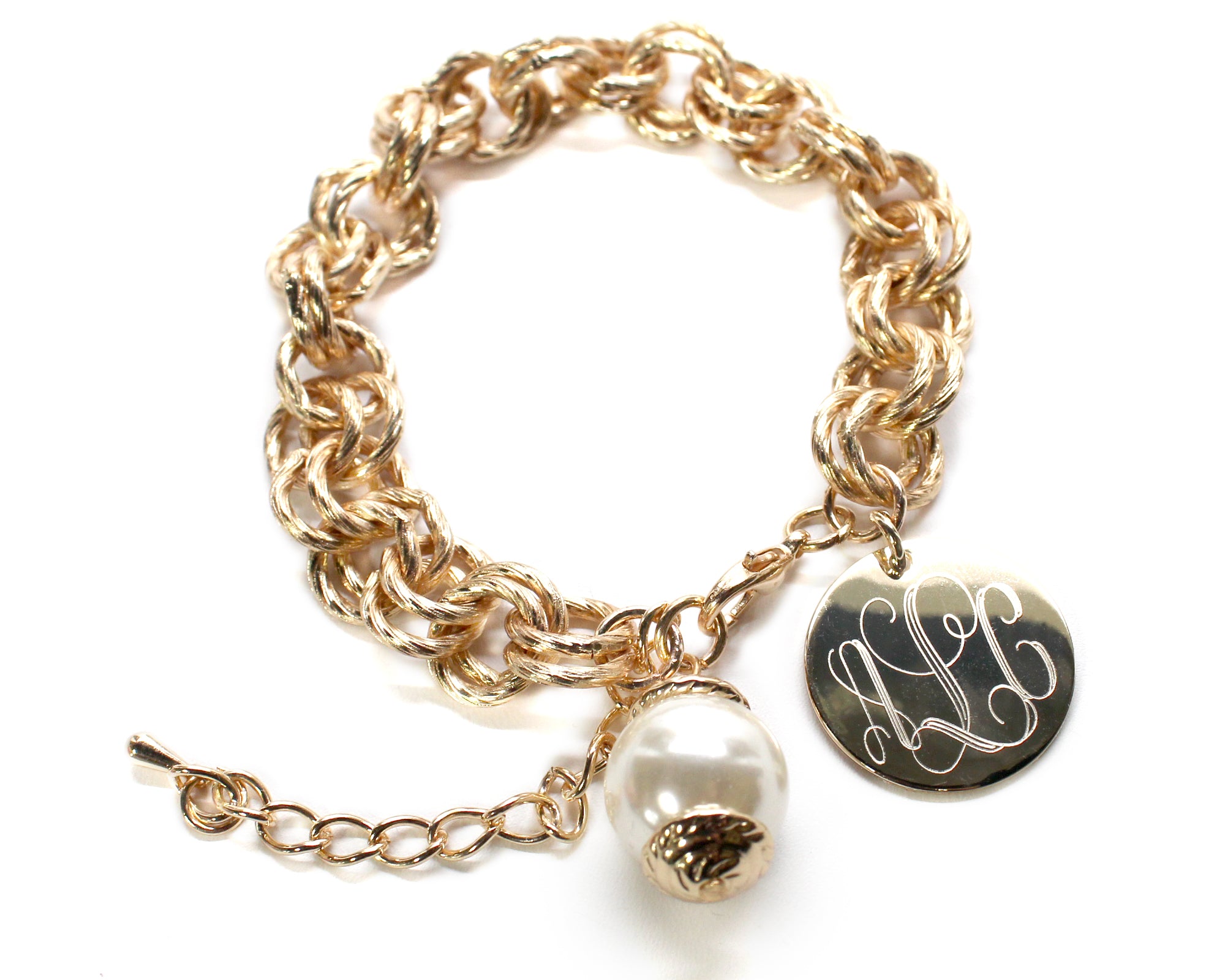Blank or Monogram Engraved Gold Link Bracelet with Drop Pearl