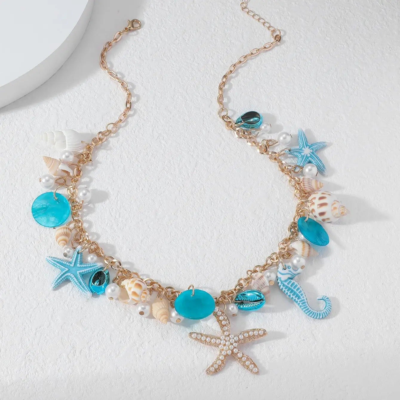 Ocean Series Shell Starfish and Pearl Necklace in Gold or Ocean Blue.