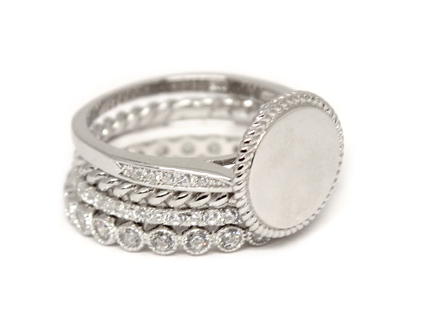 This Elegant Engraveable Cz Sterling Silver ring comes with 3 more stackable Cz rings. Perfect for any occasion. Engraveable disc measures approximately 10mm. Available in sizes 6-9. Please put the size of your choice inĀ a note once the item is added to your order.