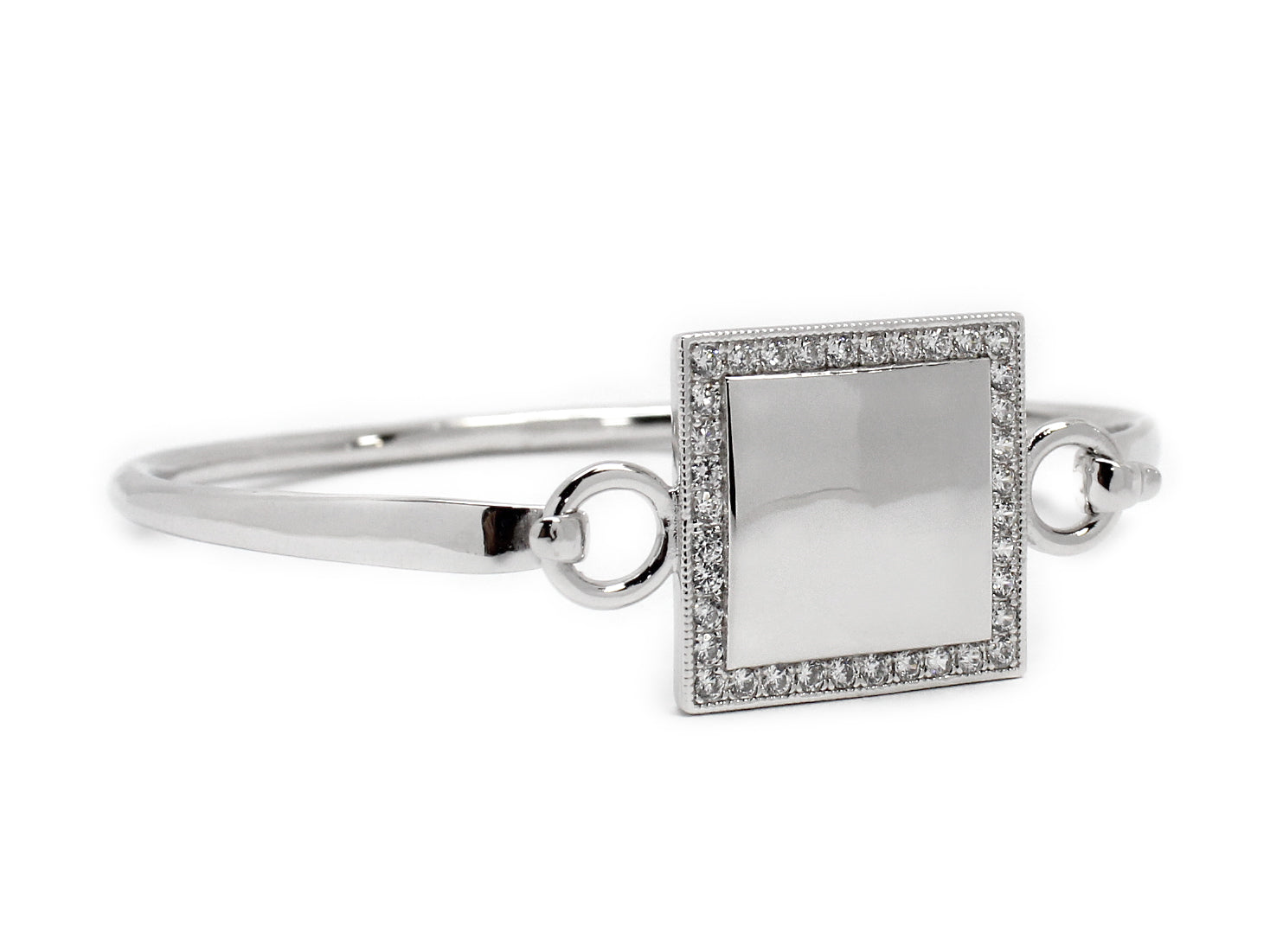 Personalize this Silver square bangle bracelet bordered by sparkling CZ stones. Engraveable face measures approximately 0.8" (20 mm) around. Bracelet fits a 7" to 7.5" wrist. If you would like your bracelet engraved, please select the engraved option. Please add a note with your engraving instructions once your item is added to your cart. Please include the font you would like for the engraving and the monogram initials you would like engraved on your bracelet. Please note that initials will be engraved in the order First, Last, Middle. For example, ifĀ the name to engrave isĀ Jessica Elizabeth Smith, your initials will be engraved in the order JSE. Silver Plated Metal. Font Options:Ā